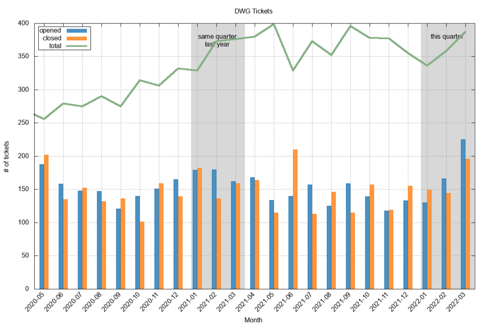 A total of 854 messages were received in the context of these tickets, and 1107 messages and memos were written by DWG members.